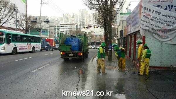 전신주와 전선, 가로등 주변이 떼 까마귀의 배설물로 더럽혀지고 있어, 각 구청과 동 주민센터에서 수시로 청소하고 있다.