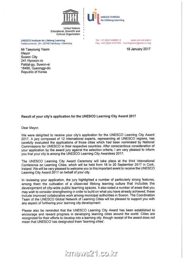 수원시가 유네스코 평생학습연구소(UIL)가 주관하는 ‘2017 유네스코 학습도시 상’을 수상한다.