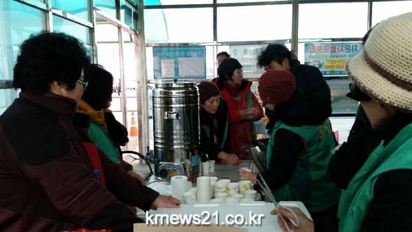 이른 새벽부터 고향으로 가기위해 발걸음을 서두른 귀성객들을 위하여 회원들이 정성들여 끓인 한방차와 함께 커피‧녹차를 대접하였고 정유년 새해 향우민들의 건강을 기원하며 직접지은 따끈따끈한 가래떡을 제공하여 푸근한 고향사랑을 선보였다.