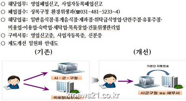 기존에는 시·군·구 영업폐업신고와 세무서 사업자등록폐업신고를 각 기관에서 접수하던 것을 식품위생업소는 2014년, 공중위생업소는 2015년부터 시·군·구 또는 세무서 한 곳에서 동시에 접수가 가능하도록 제도 개선되었다.