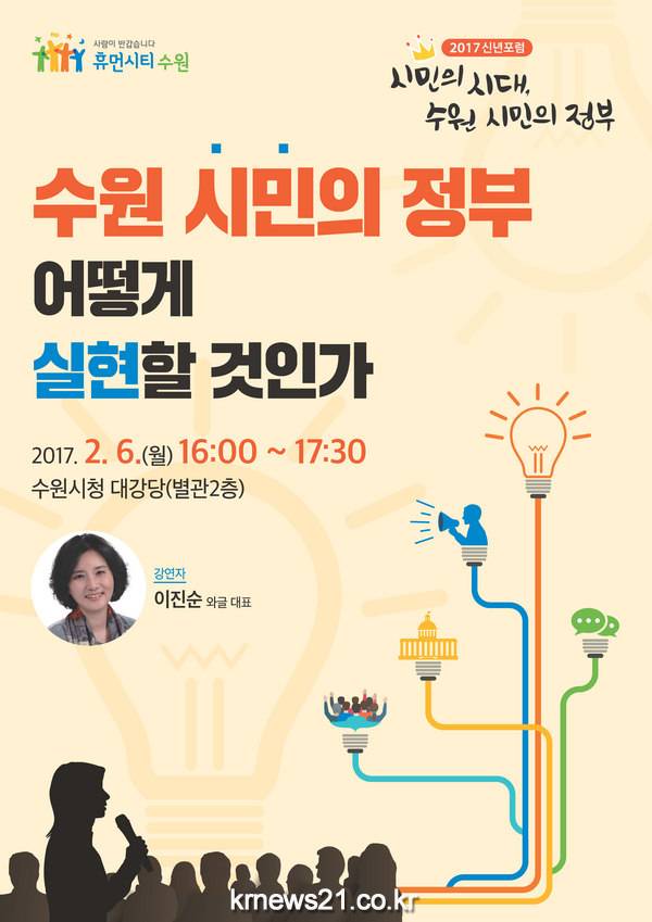 올해 직접 민주주의 실현을 지향하는 ‘수원 시민의 정부’ 추진을 선언한 수원시는 시민의 공감대 확산을 위해 신년포럼을 열고 있다. 이번 포럼에는 이진순 와글 대표가 강연자로 나서 직접민주주의의 실현방안에 대해 이야기할 예정이다.