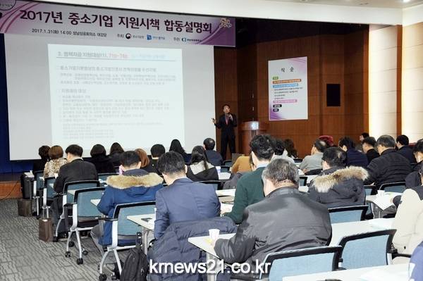 성남상공회의소(회장 박용후)는 1월 31일(화) 오후 2시 성남상공회의소 3층 대강당에서 관내 중소・중견기업에게 다양한 기업지원서비스를 소개하기 위하여「2017년 중소기업 지원시책 합동 설명회」를 개최하였다.