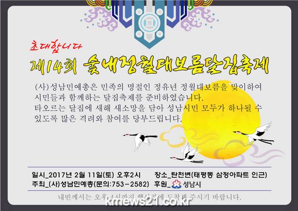 정월대보름을 맞이하여 성남시민과 지역예술인들이 함께 만드는 축제의 한마당 ‘제14회 숯내정월대보름달집축제’가 오는 2월 11일 오후2시부터 탄천 변(태평역 삼정아파트 인근)에서 개최된다.