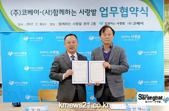 2017년 02월 08일 (사)함께하는 사랑밭이(주)코베이와 지역사회 공헌 및 연예인 애장품 경매 수익금 기부를 위한 업무협약식을 진행했다고 9일 밝혔다.