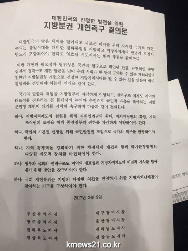 또한 자치입법권 확대, 자치재정권 확립, 자치 조직권 보장, 국회 개헌특위에 지방자치단체장이 참여하는 기구 구성 등을 골자로 한 ‘대한민국의 진정한 발전을 위한 지방분권 개헌촉구 결의문’도 채택했다.