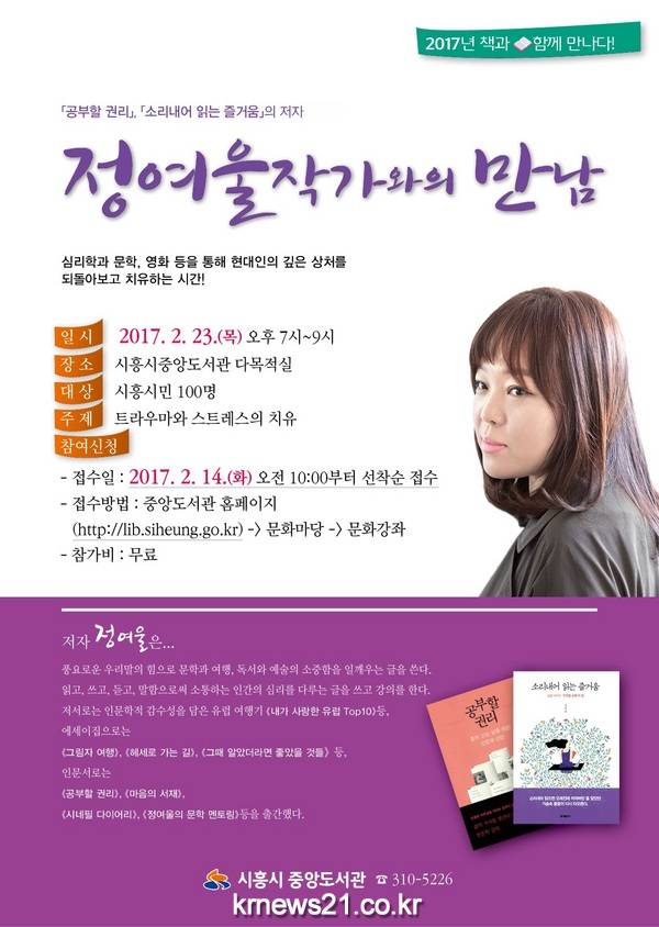 시흥시중앙도서관(관장 조정래)은 오는 23일(목) 저녁 7시부터 중앙도서관 다목적실에서 ‘정여울 작가와의 만남’ 행사를 운영한다.