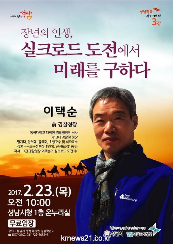 성남시(시장 이재명)는 이택순 전 경찰청장을 초청해 ‘성남행복 아카데미 3강’ 강연을 연다.