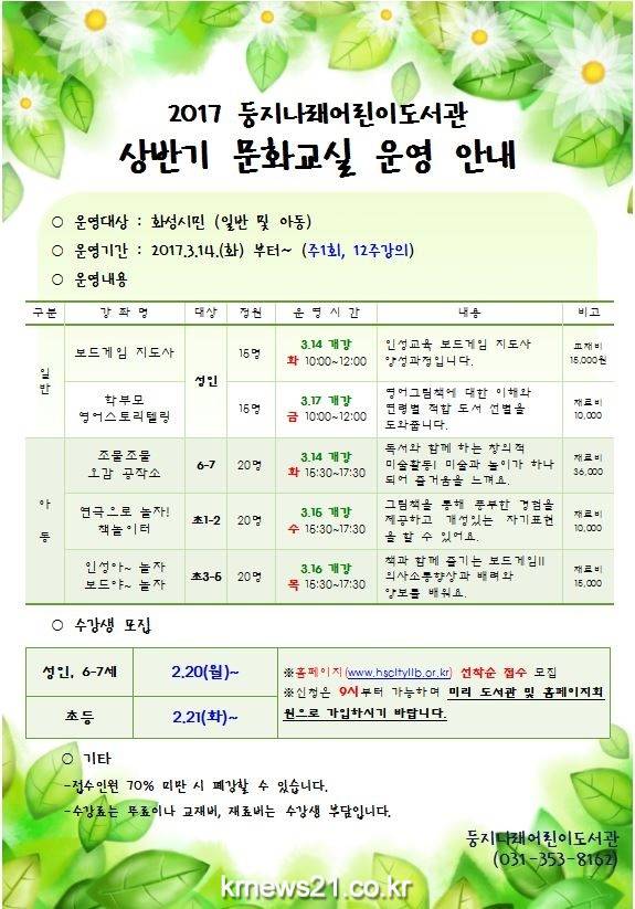 (재)화성시 문화재단 화성시 시립도서관(관장 강신하)에서는 독서문화전파와 평생교육센터로의 역할을 다하고자 2017년도 상반기 문화교실을 운영한다고 밝혔다.