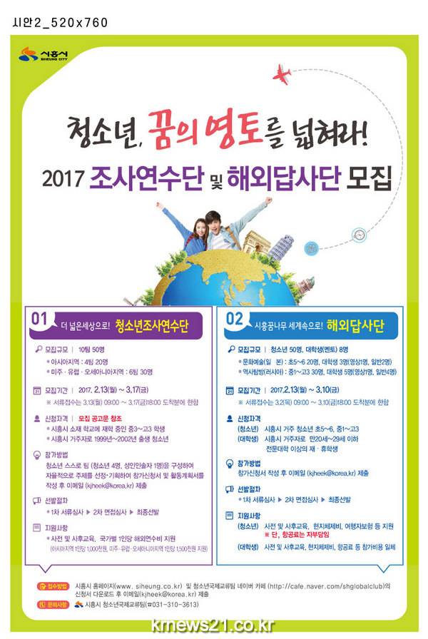 시흥시는 관내 청소년들의 국제적인 역량을 강화하고 글로벌 리더로서의 성장을 지원하고자 2017년「더 넓은 세상으로! 청소년조사연수단」과「시흥꿈나무 세계 속으로! 해외답사단(문화예술, 역사탐방)」에 함께 할 청소년을 모집한다.