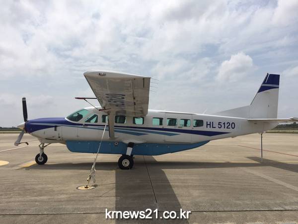 이날 이 지사가 탑승한 항공기는 미국 세스나사에서 제작한 그랜드 카라반 208B이다. 항속거리 1천982㎞, 평균 시속 300㎞로 14인승이지만 ‘스카이 투어’를 위해 10인승으로 개조해 모든 좌석을 VIP시트로 구성했다.