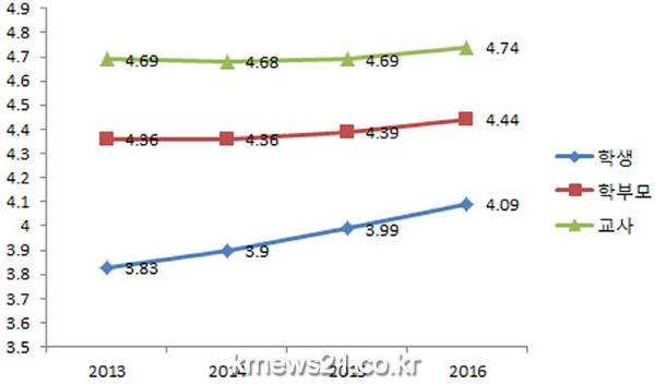 2013~2016년 설문 조사 결과 추이에서도 사업 필요성은 학생(4.69→4.68→4.69→4.74점)이 꾸준히 높은 점수를 매겼고 학부모(4.36→4.36→4.39→4.44), 교사(3.83→3.90→3.99→4.09)순이었다.