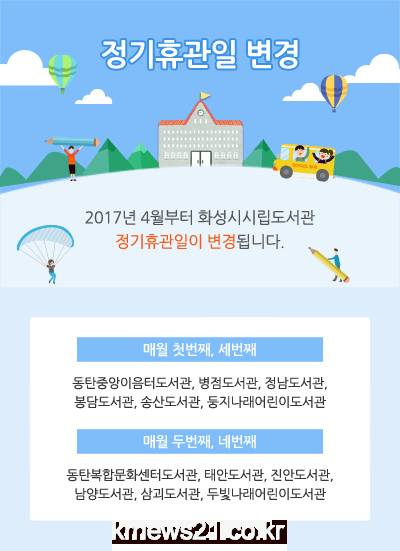 화성시 문화재단 화성시 시립도서관(관장 강신하)이 4월부터 도서관별로 정기 휴관일을 변경하여 운영한다.