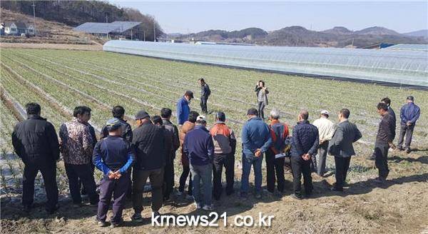 다니면서 겨울 기온 차에 대한 냉해 피해 등 웃거름 시용과 생육관리 등을 생생하게 살피면서 농가들이 서로 간 질문과 대답으로 실감나는 교육을