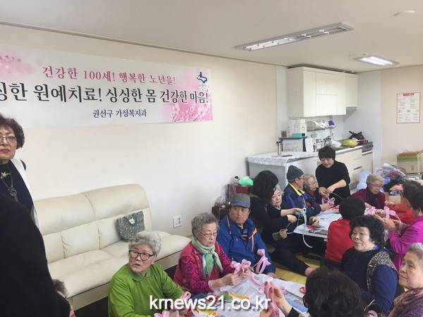 수원시 권선구(구청장 이필근)는 22일부터 호매실동 능실마을 22단지 아파트 경로당에서 어르신 대상으로 꽃꽂이, 수경재배, 액자 만들기 등으로 두 달간 총 8회 원예치료 프로그램을 운영한다.