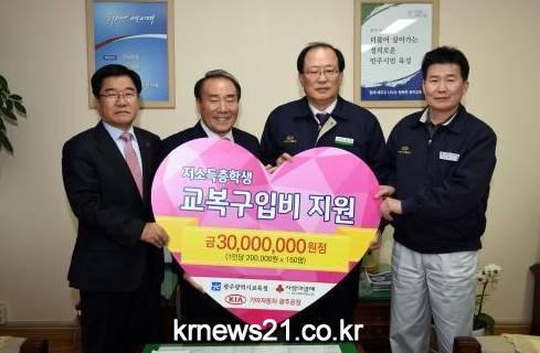 기아자동차 광주공장 노사는 22일 광주시교육청에서 지역사회 저소득층 청소년 교복구입비 3000만원을 전달했다.