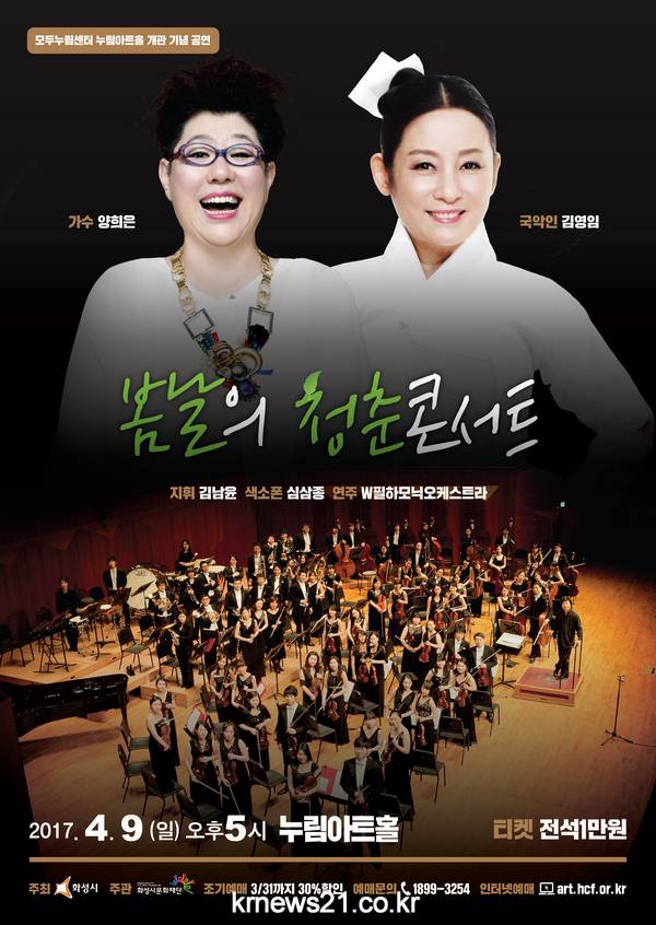 화성시 남양에 개관하는 모두 누림 센터 누림 아트홀의 개관을 기념하며 오는 4월8일 <</span>브로콜리너마저 콘서트>와 4월9일 가수 양희은과 국악인 김영임, W필하모닉오케스트라(지휘 김남윤)이 함께 하는 <</span>봄날의 청춘콘서트>를 개최한다. 누림 아트홀은 390석 규모의 프로시니엄무대를 갖춘 전문공연장으로 2017년 4월 정식 개관을 앞두고 있다.