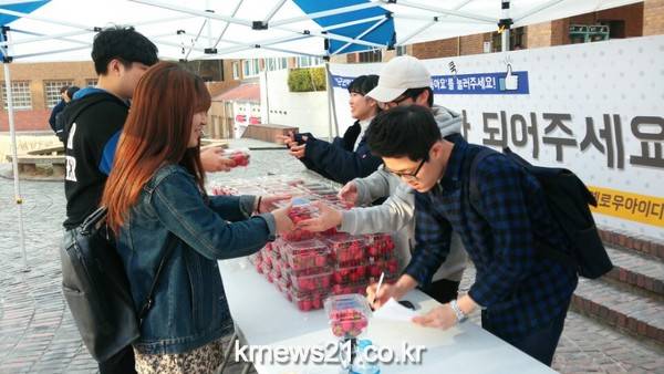 농업기술센터는 23일 성균관대 학생회관에서 학생 200여 명에게 딸기 100㎏을 판매했다. 이날 판매된 딸기는 농업기술센터의 기술지도·생산지원을 받아 재배한 것이다.