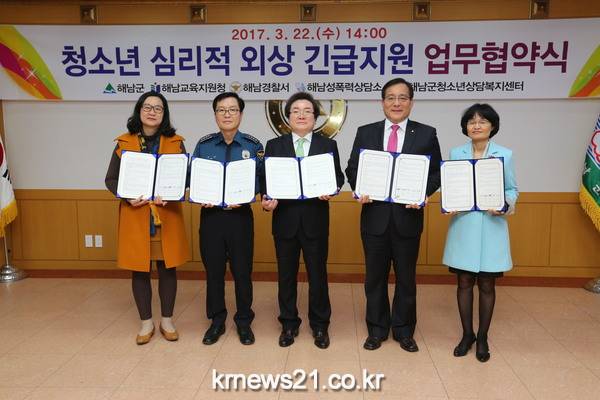 해남군은 지난 22일 해남교육지원청, 해남경찰서, 해남성폭력상담소, 해남군청소년상담복지센터 등 5개 기관과 함께 청소년의 심리적 외상을 긴급지원하기 위한 업무협약을 체결했다.