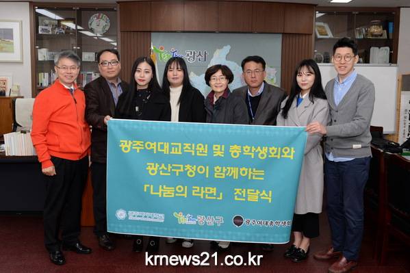 광주여자대학교 제19대 총학생회가 라면 2000개를 투게더광산 나눔문화재단에 28일 지정 기탁했다.
