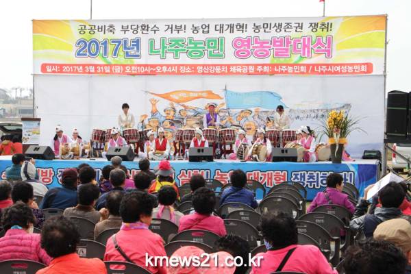 올 한 해 농사의 시작을 알리고 풍년을 기원하는 2017년 나주농민 영농발대식이 3월 31일 오전 10시 30분부터 영산강 둔치체육공원에서 농업인 및 읍․면․동 기관, 단체, 임직원 등 2천여명이 참석한 가운데 성황리에 개최됐다.