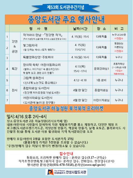 16일 일요일에는 오후 2시에 중앙도서관 2층 하늘정원에서는 ‘하늘정원 북적북적 프리마켓’이 진행될 예정이다. 이 행사는 어린이와 시민들이 참여하여 자원 재활용가치를 몸소 체험하고, 다양한 체험 프로그램을 통해 도서관 이용 활성화와 경제관념 교육의 일환으로 기획되었으며, 사전에 안성시립도서관 가족 15팀을 모집하여 시민들이 자유롭게 구매할 수 있도록 운영된다. 이 밖에 중앙도서관에서는 도서관주간 행사로 그림책 원화전시, 테마 도서 전시, 도서관 프렌즈 카드 만들기, 걱정인형 만들기, 책갈피 만들기 등 다채로운 체험행사 등이 진행될 예정이다.