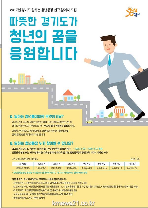 광주시는 오는 10일부터 21일 까지 일하는 청년들의 자산 형성을 지원해주는 “일하는 청년통장“ 참여자를 모집키로 했다.