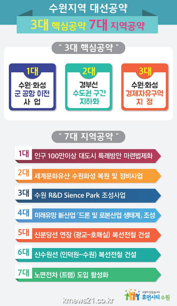 7대 지역 공약은 인구 100만 이상 대도시 특례방안 법제화, 세계문화유산 수원화성 복원·정비사업, 수원 R&D 사이언스 파크 조성 사업, 미래유망 신산업 ‘드론 및 로봇산업 생태계’ 조성, 신분당선 연장(광교~호매실) 복선전철 건설, 신수원선(인덕원~수원) 복선전철 건설, 노면전차(트램) 도입 활성화다.