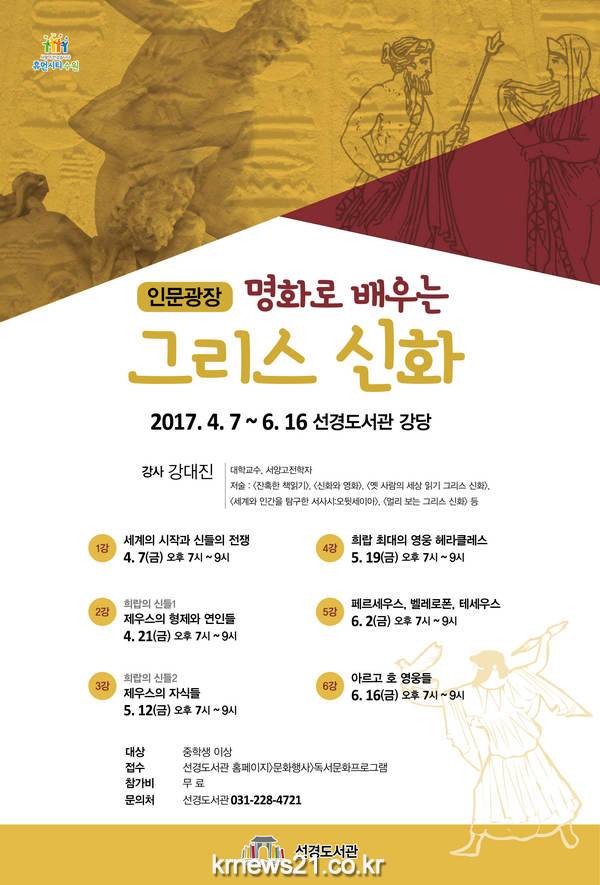 서양고전학자 강대진 교수가 강사로 나서 세계의 시작과 신들의 전쟁(4월 7일), 제우스의 형제와 연인들(4월 21일), 제우스의 자식들(5월 12일), 희랍 최대의 영웅 헤라클레스(5월 19일), 페르세우스, 벨레로폰, 테세우스(6월 2일), 아르고 호 영웅들(6월 16일) 순으로 강의한다.