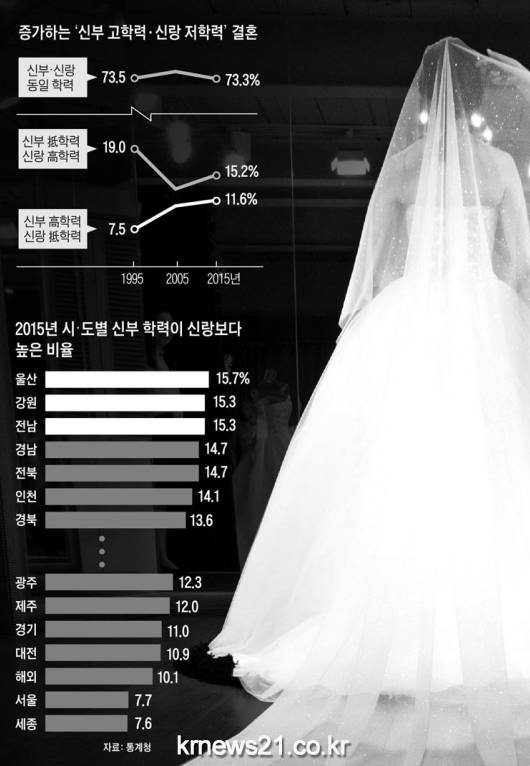2015년의 경우 23만5085건의 혼인 가운데 '대졸(전문대, 4년제, 대학원 포함) 신부+고졸 신랑' '고졸 신부+중졸 신랑' 같은 사례가 2만7173건(11.6%)이었다. 여성 아홉 명 중 한 명은 자신보다 학력이 낮은 남성과 결혼한 셈이다. 특히 '석사·학사 신부'가 고졸 이하 신랑과 만나는 경우는 2010년 10.1%에서 2015년 11.3%로 증가했다. 울산은 이 수치가 2015년 15.1%, 전남은 14.5%, 강원 14.3%, 인천 13.3%로 높았다.