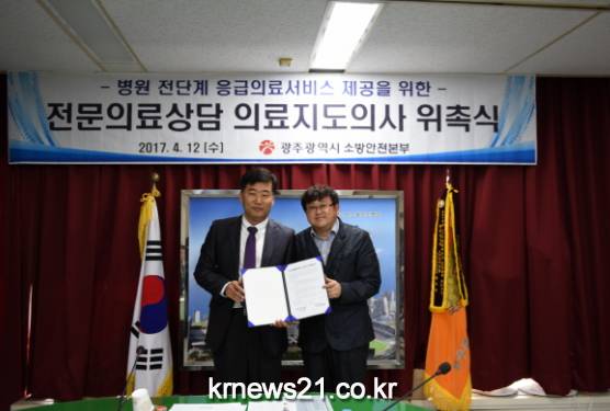 광주광역시 소방안전본부는 전문적인 응급의료서비스를 24시간 제공하기 위한 ‘2017년 전문의료상담 의료지도의사 위촉계약식’을 12일 119종합상황실에서 열었다.