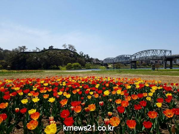 금강신관공원 미르섬에는 튤립이 피어나기 시작해 새봄을 알렸으며, 노란 유채꽃과 붉은