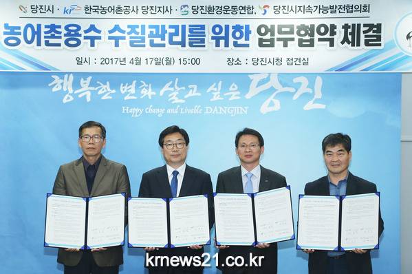 당진시청에서 농어촌 용수 수질개선을 위한 업무협약을 체결했다. 이날 협약은 농어촌 용수의 수질보전을 통해 농어촌 지역의 가치를