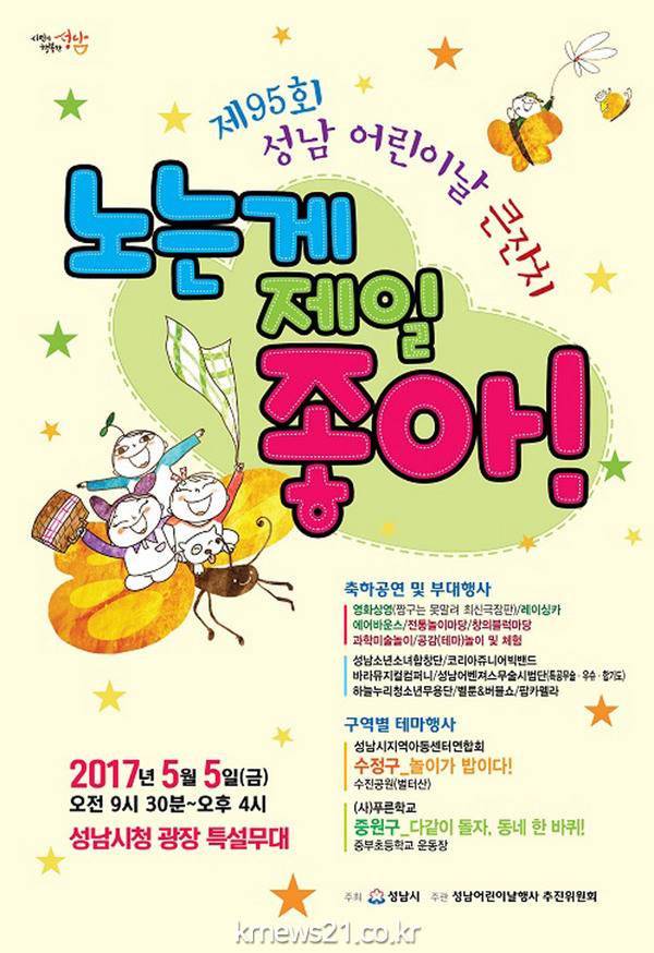 성남시(시장 이재명)는 오는 5월 5일 시청 광장을 놀이터로 개방해 ‘노는 게 제일 좋아~’를 주제로 한 어린이날 큰 잔치를 연다.