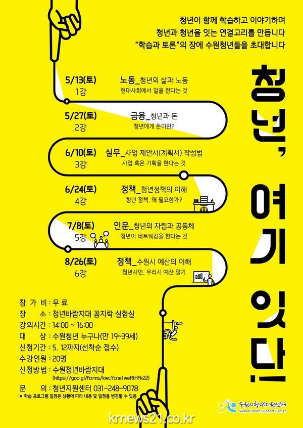 한편 수원시 청년지원센터는 청년들이 주도하는 참여형 학습·토론 프로그램 ‘청년, 여기 잇다’ 참여자도 모집한다. 청년과 청년을 ‘잇는’ 연결고리를 만든다는 뜻에서 붙은 프로그램 제목이다.