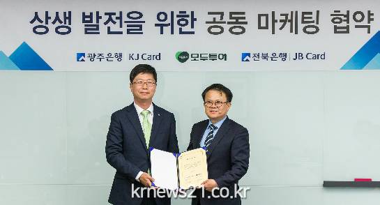 광주은행(은행장 김한)은 12일 광주은행 본점에서 여행전문회사인 ㈜모두투어 네트워크와 신용카드 공동마케팅 업무 협약을 체결했다.