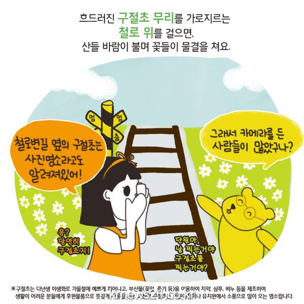 이규환 단원구청장은 “이번에 소개된 단원 산책숲길 4경 ‘수인선 철로변길’은 도심 속 교각하부를 문화휴식 공간으로 조성하고, 구절초 꽃이 활짝 피고 금개구리가 있는 생태공간으로 거듭난 뜻깊은 산책길”이라며 “가을이면 구절초가 아름답게 피어 어린이집이나 유치원에서 소풍으로 많이 오고, 사진명소로도 알려져 있다”고 말했다.