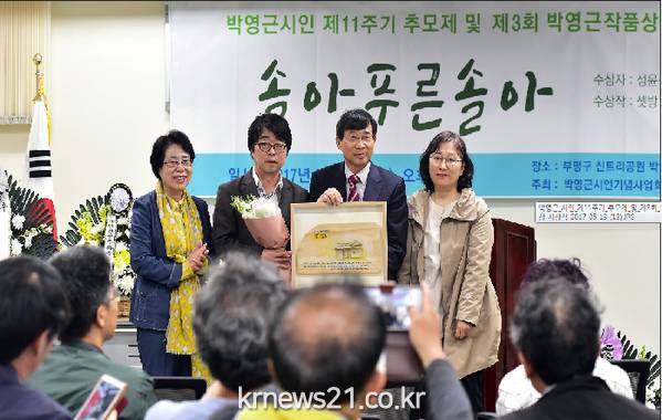 가수 안치환의 대표 노래 중 하나인 ‘솔아 솔아 푸르른 솔아’의 원작시를 쓴 작가로 널리 알려진 ‘박영근 시인 제11주기 추모제 및 제3회 작품작 시상식’이 지난 13일(토) 오후 홍미영 부평구청장 등이 참석한 가운데 부평구청 상황실에서 열렸다.