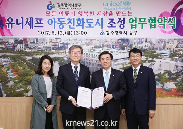광주 동구(청장 김성환)가 지난달 동구의회, 동부경찰서, 동부소방서, 동부교육지원청, 광주YMCA 등과 협약을 체결한데 이어 12일 유니세프한국위원회(사무총장 서대원)와 업무협약식을 개최하며 아동친화도시 조성에 박차를 가하고 있다.