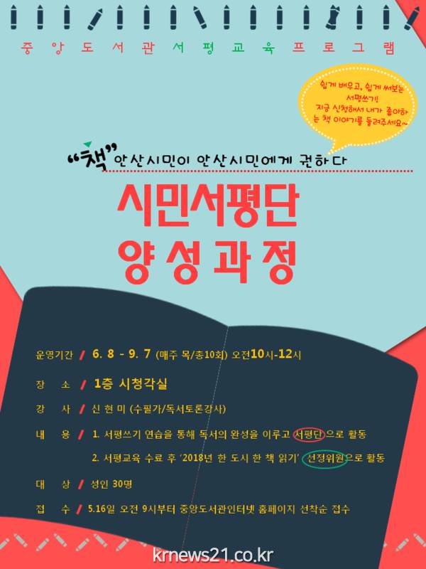 안산시 중앙도서관은 6월 8일부터 9월 7일까지 중앙도서관 1층 시청각실에서 ‘성인 서평글쓰기 수업’을 진행한다.