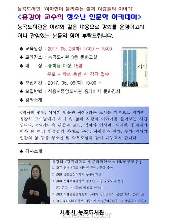 시흥시 능곡도서관은 5월 23일(화) 오후 17:00 능곡도서관 3층 문화교실에서 <</span>유강하 교수의 청소년 인문학 아카데미, 사마천이 들려주는 삶과 사람들의 이야기>를 운영한다.