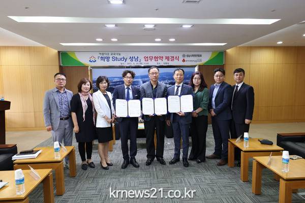 성남시(시장 이재명)와 성남시학원연합회(회장 엄덕수), 경기 사회복지 공동모금회(회장 최신원)는 5월 25일 시청 9층 상황실에서 저소득층 청소년 학원 무료 수강 지원사업인 ‘희망 스터디 성남’ 사업에 관한 협약을 했다.
