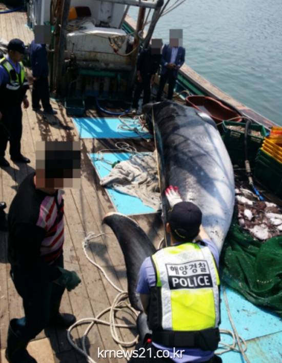 신고를 접수받은 신진안전센터 경찰관 3명은 오후 2시 15분경 신진항에 입항하는 D호를 확인하고, 금속 탐지기를 이용 고래 몸속에 작살 등 금속물이 있는지 여부와 선장과 선원을 대상으로 혼획 경위 등을 확인한 결과 불법으로 포획여부 등은 발견하지 못 하였다.