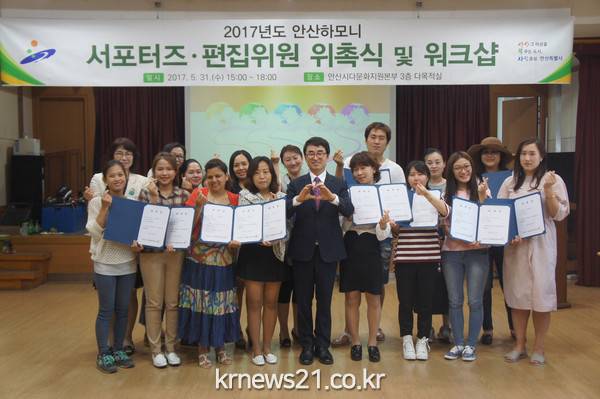 안산시 다문화지원본부(본부장 이창우)는 지난 31일 본부 3층 다목적실에서 2017년 안산하모니 서포터즈와 편집위원 8개국 26명에 대한 위촉식 및 워크숍을 개최했다.