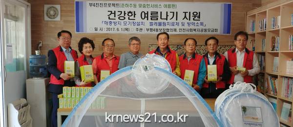 부평4동 지역사회보장협의체는 이날 무더위를 앞두고 건강에 취약한 독거노인 등 100가구에 해충방지를 위한 원터치 모기장 설치와 함께 벌레물림치료제를 구입해 전달했다.
