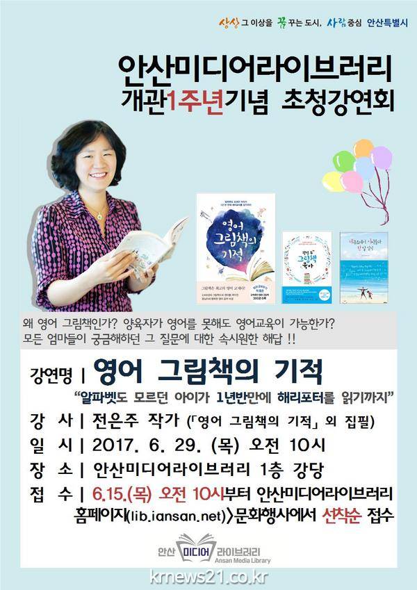 안산미디어라이브러리에서는 개관 1주년을 기념하여 자녀의 영어교육에 대해 고민이 많은 학부모에게 속 시원한 해답을 줄 수 있는 ‘영어 그림책의 기적’ 강연을 진행한다.