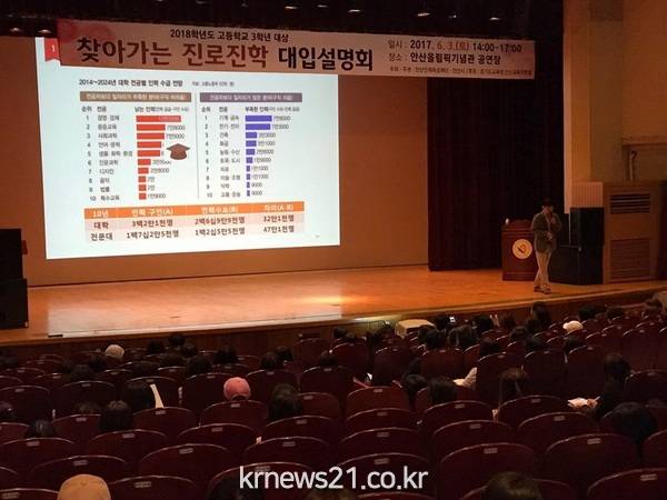 안산시 안산인재육성재단(이사장 제종길 안산시장)은 지난 3일 안산 올림픽 기념관 공연장에서 관내 고등학교 3학년 학생들과 학부모 대상으로 ‘2018학년도 고3대상 찾아가는 진로진학 대입설명회’ 개최했다.