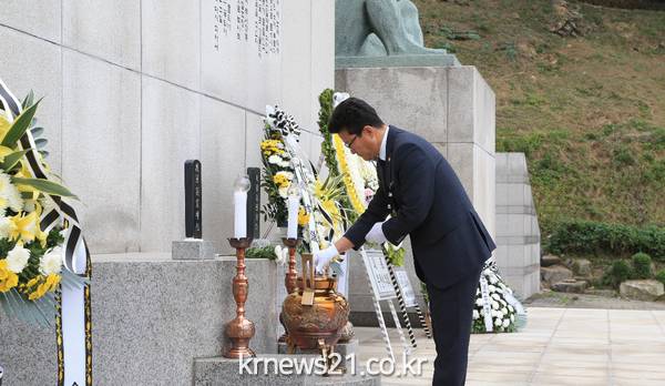 강동구 부천시의회 의장은 지난 오전 10시 원미공원 내 거행된 현충탑에서 제62회 현충일 추념식에 참석하여 헌화 및 분양하고 순국선열과 호국영령의 명복을 빌었다.