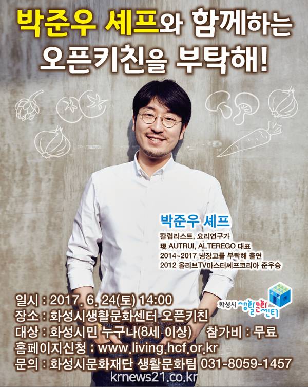 화성시 문화재단 생활문화센터(대표이사 권영후)에서 오는 6월 25일 박준우 셰프를 초청해 쿠킹 쇼와 토크쇼를 결합한 ‘박준우 셰프와 함께하는 오픈키친을 부탁해’를 진행한다.