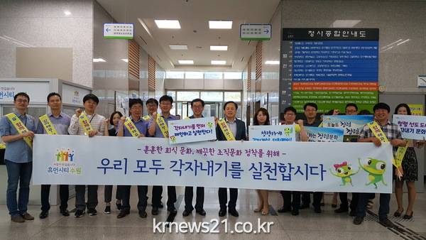 수원시가 9일 오전 수원시청에서 출근하는 공직자들을 대상으로 청탁금지법(김영란법) 안착을 위한 ‘각자 내기 실천 캠페인’을 전개했다.