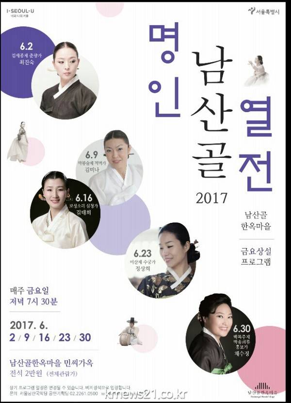 중요무형문화재 제5호 판소리 심청가 이수자 국악인 김태희 공연이 오는 6월 16일(금) 19:30 서울시 중구 필동 소재 남산골한옥마을 민씨 가옥에서 열린다. "남산골 명인열전 절대가인" 이라는 주제로 6월 매주 금요일 오후 국악공연이 펼쳐지며, 김태희는 심청가 중 ‘심봉사가 망사대(望思臺) 찾아가는 대목부터 눈 뜨는 대목까지’공연 예정이다.